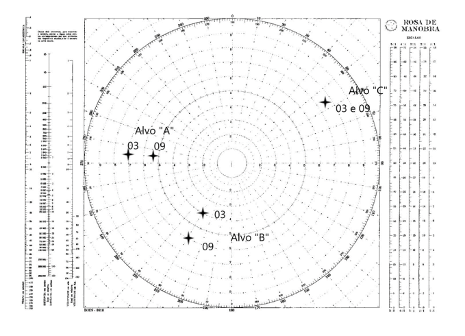 A rosa de manobra abaixo representa a apresentação PPI de um radar de uma embarcação que navega no rumo verdadeiro 030° com velocidade de 20 nós. Foram plotados três alvos em dois instantes distintos (minuto 03 e minuto 09). Com base nas informações apresentadas, marque a alternativa correta: